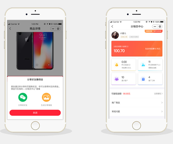 商城小程序支持分销功能,可以激励客户参与卖货,帮您实现裂变式销量增长,向昂贵的经营渠道和成本说再见。