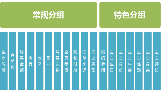 其中常规分组中的数据是CRM系统可直接获取的,特色分组中的数据就需要进行收集,一般收集的方式有问卷调查、客服收集打标、评价整理获取等等。